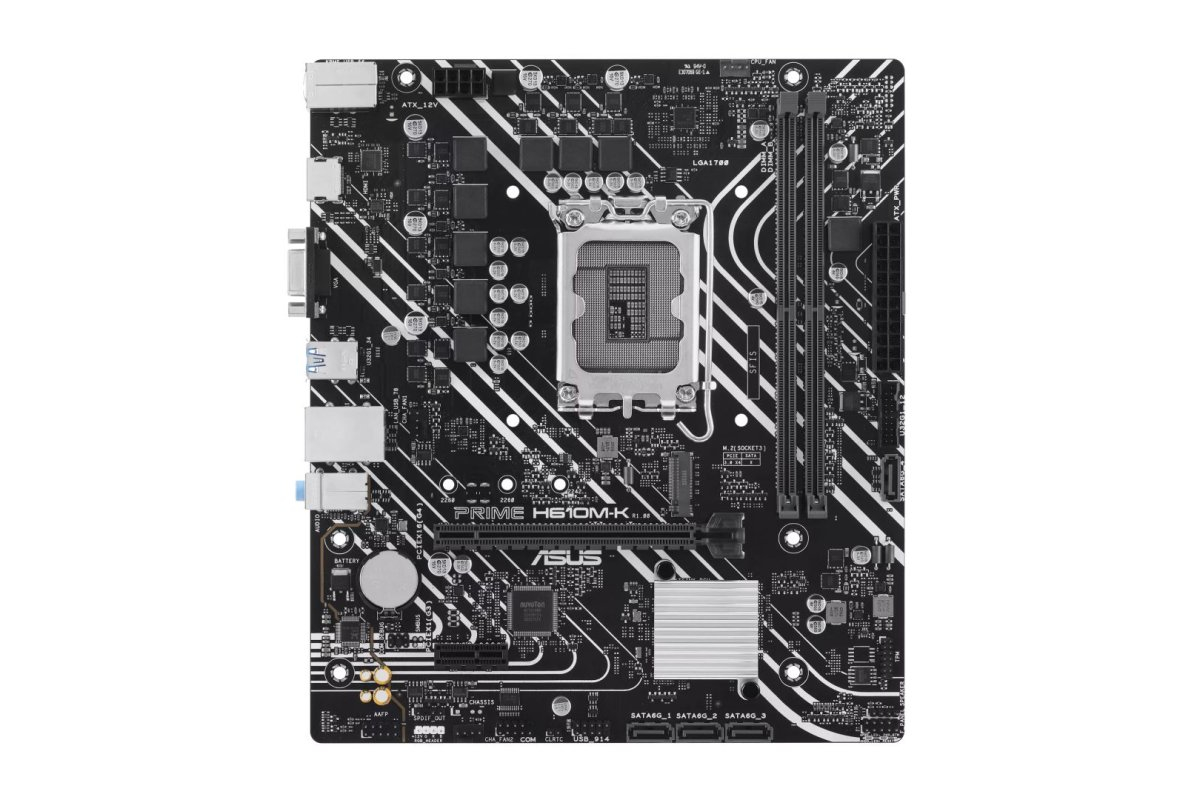 Model PRIME H610M-K CPU Intel® Socket LGA1700 for 13th Gen Intel® Core™ & 12th Gen Intel® Core™, Pentium® Gold and Celeron® Processors* Supports Intel® Turbo Boost Technology 2.0 and Intel® Turbo Boost Max Technology 3.0** * Refer to www.asus.com for CPU support list. ** Intel® Turbo Boost Max Technology 3.0 support depends on the CPU types. Chipset Intel® H610 Chipset Memory 2 x DIMM slots, Max. 96GB, DDR5 5600/5400/5200/5000/4800 Non-ECC, Un-buffered Memory* Dual Channel Memory Architecture Supports Intel® Extreme Memory Profile (XMP) * Supported memory types, data rate (speed), and number of DRAM modules vary depending on the CPU and memory configuration, for more information please refer to CPU/Memory Support list under the Support tab of product information site or visit https://www.asus.com/support/. * Non-ECC, un-buffered DDR5 memory supports On-Die ECC function. Graphics 1 x VGA port 1 x HDMI™ port** * Graphics specifications may vary between CPU types. Please refer to www.intel.com for any updates. ** Supports 4K@60Hz as specified in HDMI 2.1. Expansion Slots Intel® 13th & 12th Gen Processors 1 x PCIe 4.0 x16 slot Intel® H610 Chipset 1 x PCIe 3.0 x1 slot - To ensure compatibility of the device installed, please refer to https://www.asus.com/support/ for the list of supported peripherals. Storage Total supports 1 x M.2 slot and 4 x SATA 6Gb/s ports Intel® H610 Chipset M.2 slot (Key M), type 2242/2260/2280 (supports PCIe 3.0 x4 mode) 4 x SATA 6Gb/s ports Ethernet 1 x Realtek 1Gb Ethernet USB Rear USB (Total 6 ports) 2 x USB 3.2 Gen 1 (5G) ports (2 x Type-A) 4 x USB 2.0 ports (4 x Type-A) Front USB (Total 4 ports) 1 x USB 3.2 Gen 1 (5G) header supports 2 additional USB 3.2 Gen 1 ports 1 x USB 2.0 header supports 2 additional USB 2.0 ports Audio Realtek 7.1 Surround Sound High Definition Audio CODEC* - Supports: Jack-detection, Multi-streaming, Front Panel Jack-retasking - Supports up to 24-Bit/192 kHz playback Audio Features - Audio Shielding - Premium audio capacitors - Dedicated audio PCB layers * A chassis with an HD audio module in the front panel is required to support 7.1 Surround Sound audio output. Back Panel I/O Ports 2 x USB 3.2 Gen 1 (5G) ports (2 x Type-A) 4 x USB 2.0 ports (4 x Type-A) 1 x VGA port 1 x HDMI™ port 1 x Realtek 1Gb Ethernet port 3 x Audio jacks 1 x PS/2 Keyboard/Mouse combo port Internal I/O Connectors Fan and Cooling related 1 x 4-pin CPU Fan header 2 x 4-pin Chassis Fan headers Power related 1 x 24-pin Main Power connector 1 x 8-pin +12V Power connector Storage related 1 x M.2 slot (Key M) 4 x SATA 6Gb/s ports USB 1 x USB 3.2 Gen 1 (5G) header supports 2 additional USB 3.2 Gen 1 ports 1 x USB 2.0 header supports 2 additional USB 2.0 ports Miscellaneous 1 x RGB header 1 x Clear CMOS header 1 x Front Panel Audio header (AAFP) 1 x COM Port header 1 x S/PDIF Out header 1 x Speaker header 1 x SPI TPM header (14-1pin) 1 x 10-1 pin System Panel header Special Features ASUS 5X PROTECTION III - DIGI+ VRM - LANGuard - Overvoltage Protection - SafeSlot Core - Stainless-Steel Back I/O ASUS Q-Design - Q-DIMM - Q-LED Core - Q-Slot ASUS Thermal Solution - Aluminum heatsink design ASUS Lighting Control - RGB header Software Features ASUS Exclusive Software Armoury Crate - Fan Xpert 2+ AI Suite 3 - EPU - DIGI+ VRM - PC Cleaner ASUS CPU-Z Norton 360 Deluxe (60 Days Free Trial) WinRAR UEFI BIOS ASUS EZ DIY - ASUS CrashFree BIOS 3 - ASUS EZ Flash 3 - ASUS UEFI BIOS EZ Mode BIOS 128 Mb Flash ROM, UEFI AMI BIOS Manageability WOL by PME, PXE Accessories Cables 2 x SATA 6Gb/s cables Miscellaneous 1 x I/O Shield 1 x M.2 Anchor Documentation 1 x User guide Operating System Windows® 11, Windows® 10 64-bit Form Factor micro-ATX Form Factor 9.2 inch x 8.0 inch ( 23.4 cm x 20.3 cm )